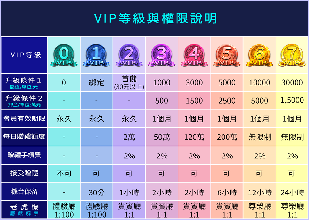 當玩家儲值/押注超過所需額度,VIP資格立刻升級,期限至升級當下的下一個月底為止。